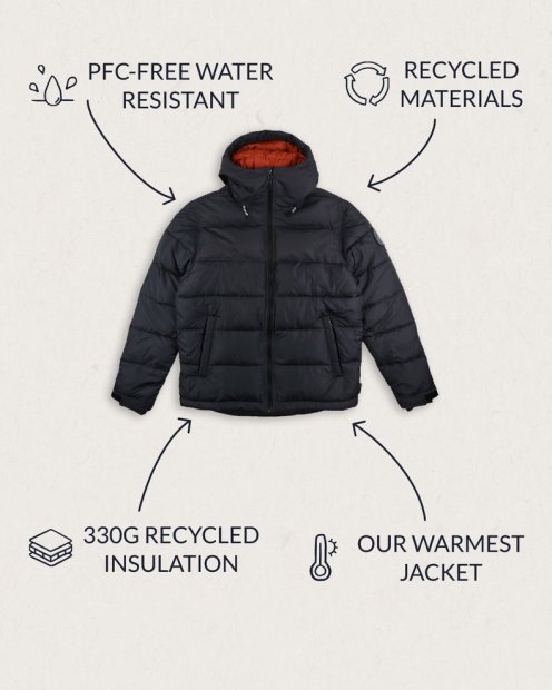 Oberes Feld - Außenmaterial Aus 50 % Recyceltem Polyester, 50 % Polyester, Oxford Taslan, Mit PFC-freier, Wasserabweisender Beschichtung (DWR). Unterer Einsatz – 100 % Recycelter REPREVE-Polyester-Ripstop (50D) Mit PFC-freier Wasserabweisender Beschichtung (DWR), Isolierung Aus 330 G Recycelter Polyester-Daunenimitation (für Veganer Geeignet) Und Nylonfutter. REPREVE-Gewebe Wird Aus Recycelten Einweg-Plastikflaschen Hergestellt Und Mit Einer PFC-freien Wasserabweisenden Beschichtung Versehen. Recyceltes Polyester Reduziert Unsere Abhängigkeit Vom Erdöl, Verringert Die Wasser- Und Luftverschmutzung, Die Bei Der Herstellung Von Reinem Polyester Entsteht, Und Verhindert Unnötigen Deponieabfall.