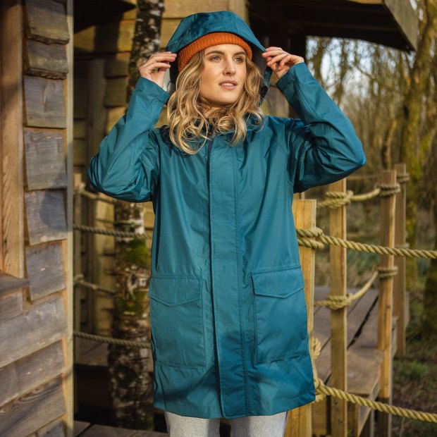 Hergestellt Aus REPREVE-Gewebe Aus 14 Recycelten Einweg-Plastikflaschen Und Mit PFC-freier Wasserabweisender Beschichtung. Die Wasserdichte Pacific-Jacke In Blaukoralle Ist Eine Traditionelle Wasserdichte Jacke Im Mac-Stil Mit Versiegelten Nähten Und Reißverschlüssen.